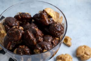 - A megtöltött fánkokat egy tálba rakjuk, és elkészítjük a csokoládészószt.